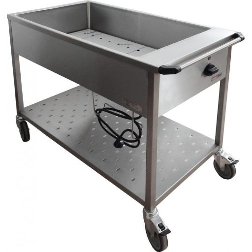 Az EMAX NM-1230KN+KSZNM egy professzionális vízfürdős melegentartó kocsi, mely három darab GN 1/1 méretű edényzet befogadására alkalmas. A készülék alsó polccal rendelkezik, amely további tárolási lehetőséget biztosít a konyhai eszközök és kellékek számára. Rozsdamentes acél kivitelének köszönhetően rendkívül tartós és higiénikus megoldás, különösen közétkeztetési környezetben való használatra ajánlott.