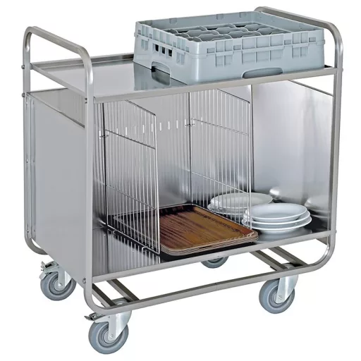 A METALCARRELLI 1270PR egy kiváló minőségű tálca és tányérszállító kocsi, mely rozsdamentes acélból készült, belül elválasztható kialakítással és felső polccal rendelkezik. Ez a praktikus eszköz ideális választás éttermek, szállodák vagy rendezvények számára.