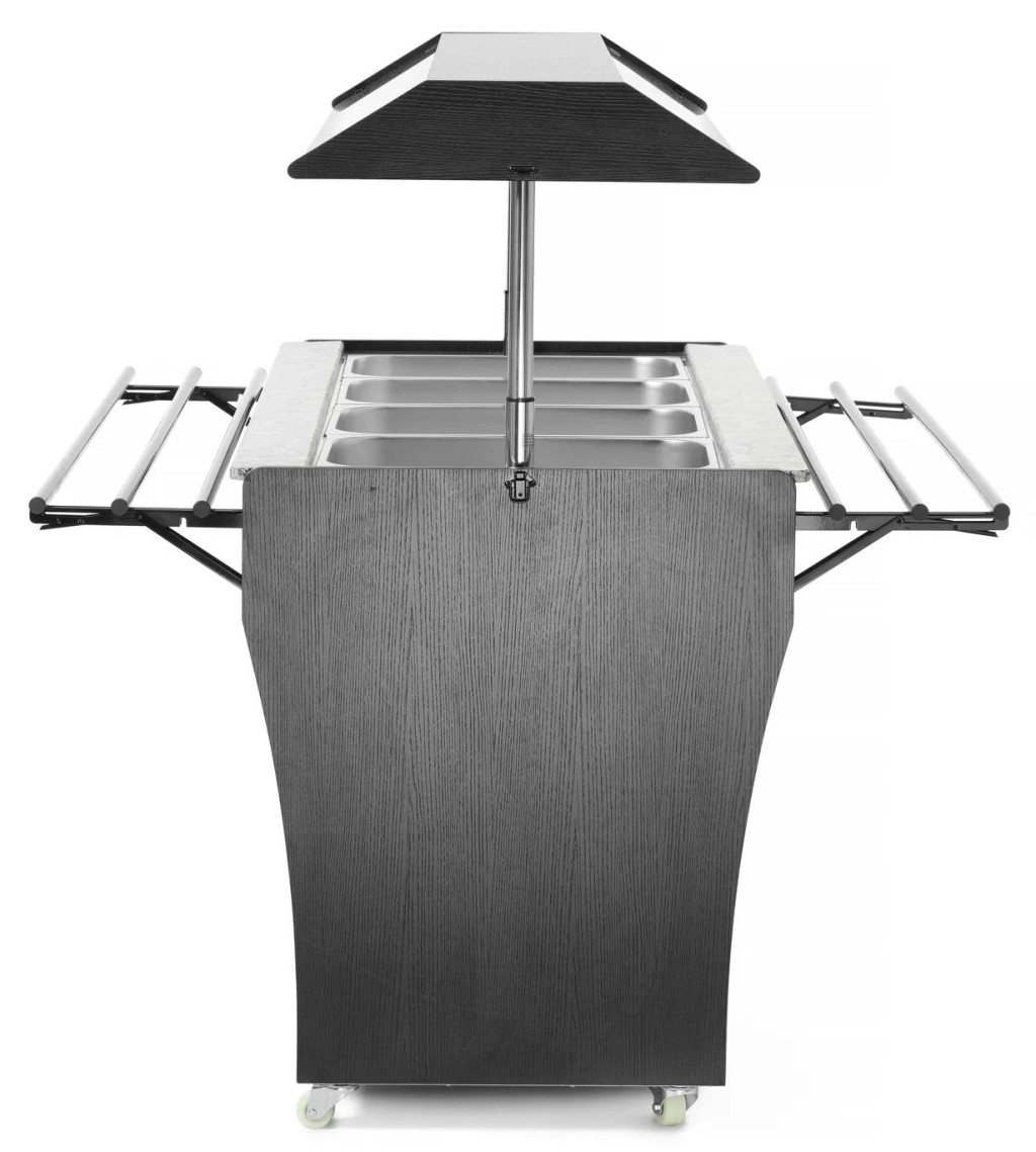 Az önkiszolgáló pult alaptartozéka 4 db GN edény! Alul polccal rendelkezik tányérok és evőeszközök tárolására.