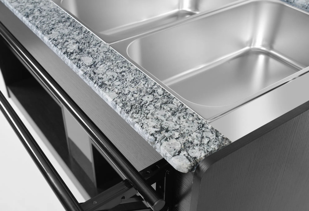 Roszdamentes acél kialakítás fekete rétegelt lemez faburkolattal.