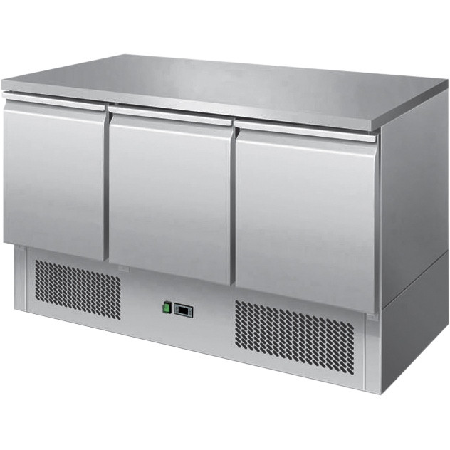 Az ESL3851 egy 3 ajtós hűtött munkaasztal, mely ideális választás lehet minden olyan konyhába, ahol fontos a friss és hűvös tárolás. A 380/254 literes bruttó/nettó űrtartalomnak köszönhetően elegendő helyet biztosít a különböző alapanyagok és ételek tárolására.