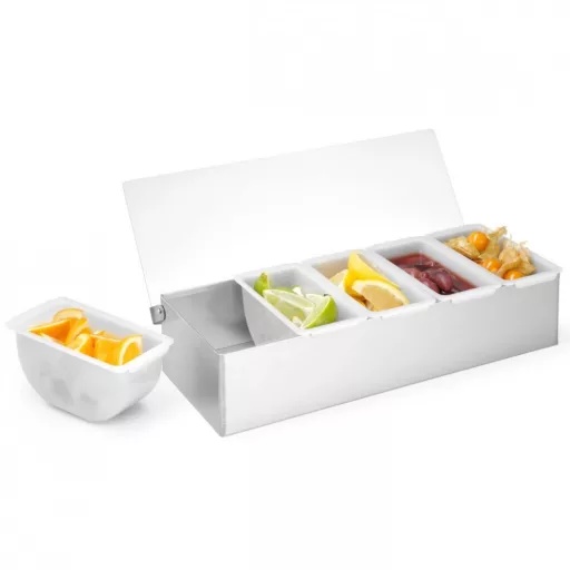 A HENDI 552100 tárolódoboz egy kiváló minőségű, rozsdamentes acélból készült bárkészlet, mely ideális választás fűszerek, díszítő termékek, koktélgyümölcsök és apró kiegészítők tárolására. A felhajtható tetővel rendelkező doboz 5db fehér polipropilén belső rekesszel van ellátva, biztosítva ezzel a tárolt anyagok szeparált elhelyezését.