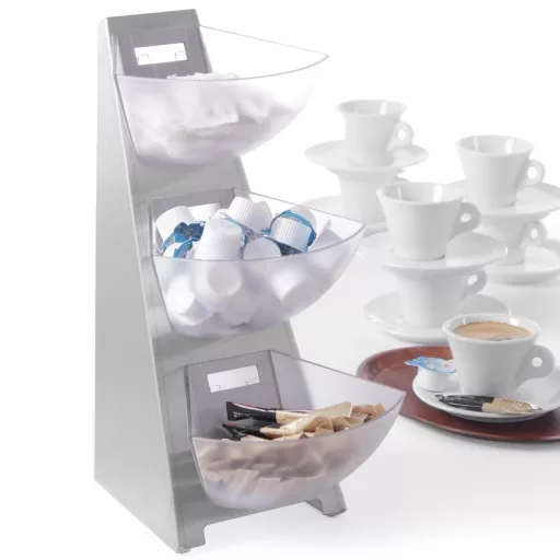 Ideális tárolóállvány kávéízesítőkhöz (cukor, tejszín, stb), filteres teához, önállóan csomagolt édességekhez, egyéb élelmiszerekhez.