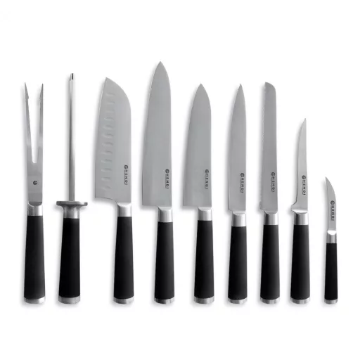 A késkészlet tartalma: húsvilla (hajlított) 320mm; késélező rúd 340mm; Santoku szakácskés 336mm; szakácskés 370mm; szakácskés 330mm; szeletelőkés 330mm; kenyérvágó kés 333mm; csontozókés 285mm; hámozókés 193mm.